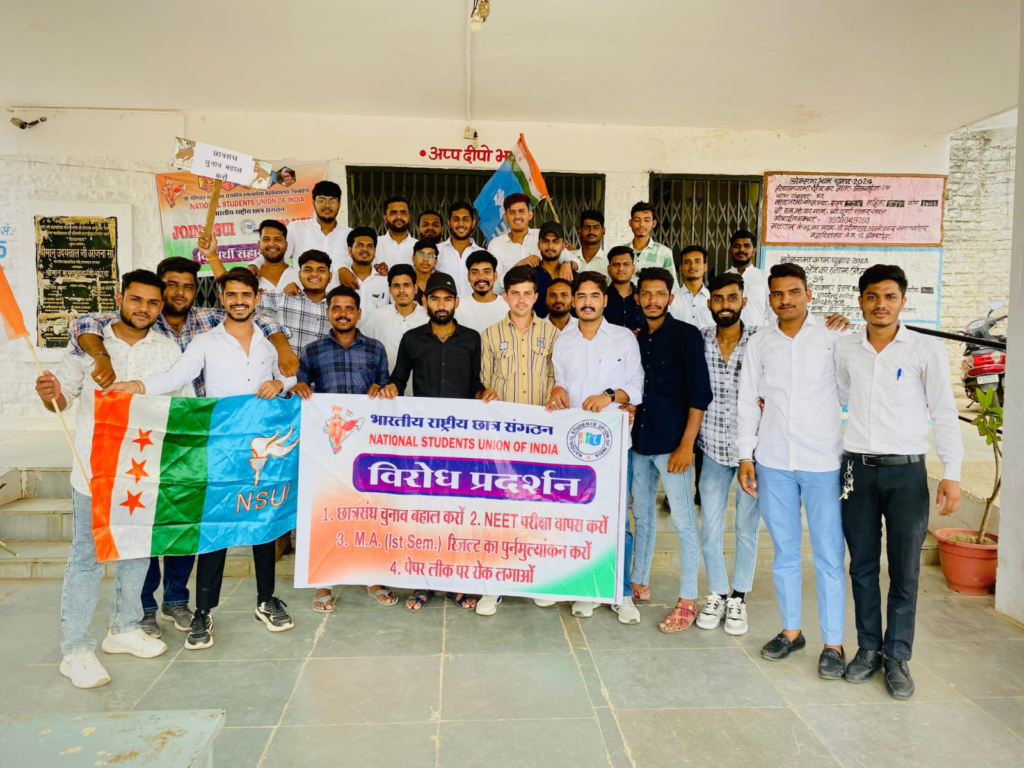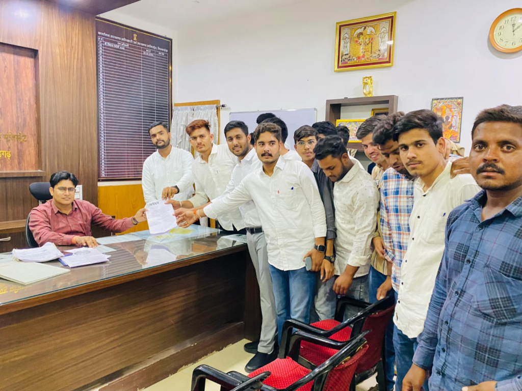 निंबाहेड़ा : एन.एस.यु.आई परिवार निम्बाहेंडा द्वारा स्थानीय राजकीय महाविद्यालय में राजस्थान सरकार व परीक्षा नियत्रंक के खिलाफ विभिन्न मांगो को लेकर विरोध प्रदर्शन किया पुर्व छात्रसंघ अध्यक्ष रोमिल चौधरी ने बताया कि छात्रहितों को सुरक्षित रखने और छात्रों की आवाज उठाने और सामाजिक सहभागीता के लिए छात्रसंघ चुनाव ही एक मात्र जरिया है पूरे प्रदेश भर में एन.एस.यु.आई राजस्थान द्वारा सभी विश्वविद्यालय और महाविद्यालय को बंद कर राजस्थान सरकार के खिलाफ विरोध प्रदर्शन कर छात्रसंघ चुनाव बहाल करने की मांग की एवं एन.एस.यु.आई ब्लाॅक अध्यक्ष विक्रम अहीर ने बताया कि NEET परीक्षा में NTA द्वारा पेपर लीक और अन्य धांधली की गई जिसमें कई योग्य छात्रों के भविष्य के साथ खिलवाड़ किया गया उक्त पेपर लीक को देखते हुए परीक्षा वापस कराने और छात्रसंघ चुनाव बहाल करानेे को लेकर महाविद्यालय को बंद कर विरोध प्रदर्शन किया व उपखण्ड अधिकारी को ज्ञापन दिया तथा छात्रनेता भंवर सिंह ने बताया कि MLSU M.A. 1 SAM के रिजल्ट जारी हुए जिसमें लगभग 70 प्रतिशत छात्रों को अनउत्तीर्ण घोषित कर दिया गया जिससे छात्रों में भारी रोष पेदा हुआ एन.एस.यु.आई कार्यकर्ता व छात्रों की इस उचित मांग को पुर्ण कर जल्द ही पुर्नमुल्यांकन कर नये रिजल्ट जारी करने हेतु प्राचार्य को परीक्षा नियत्रंक के नाम ज्ञापन सोंपा।