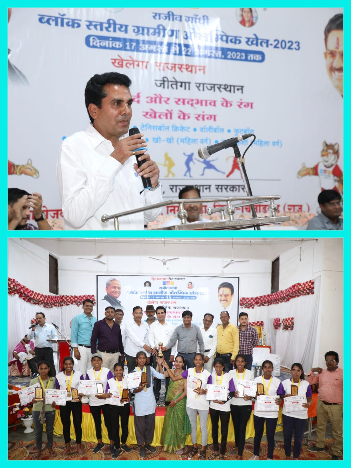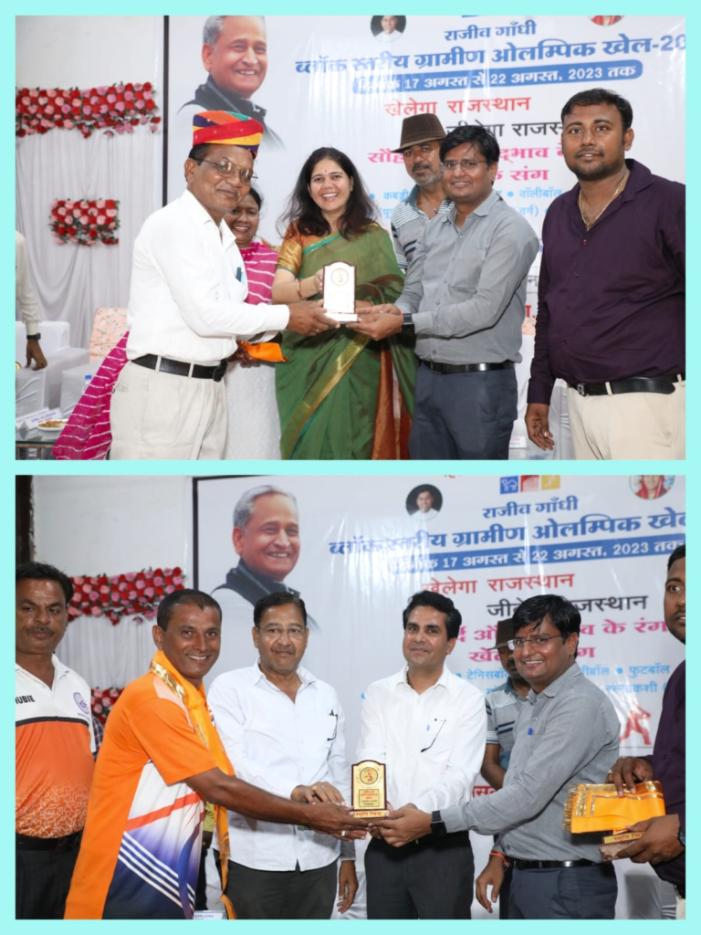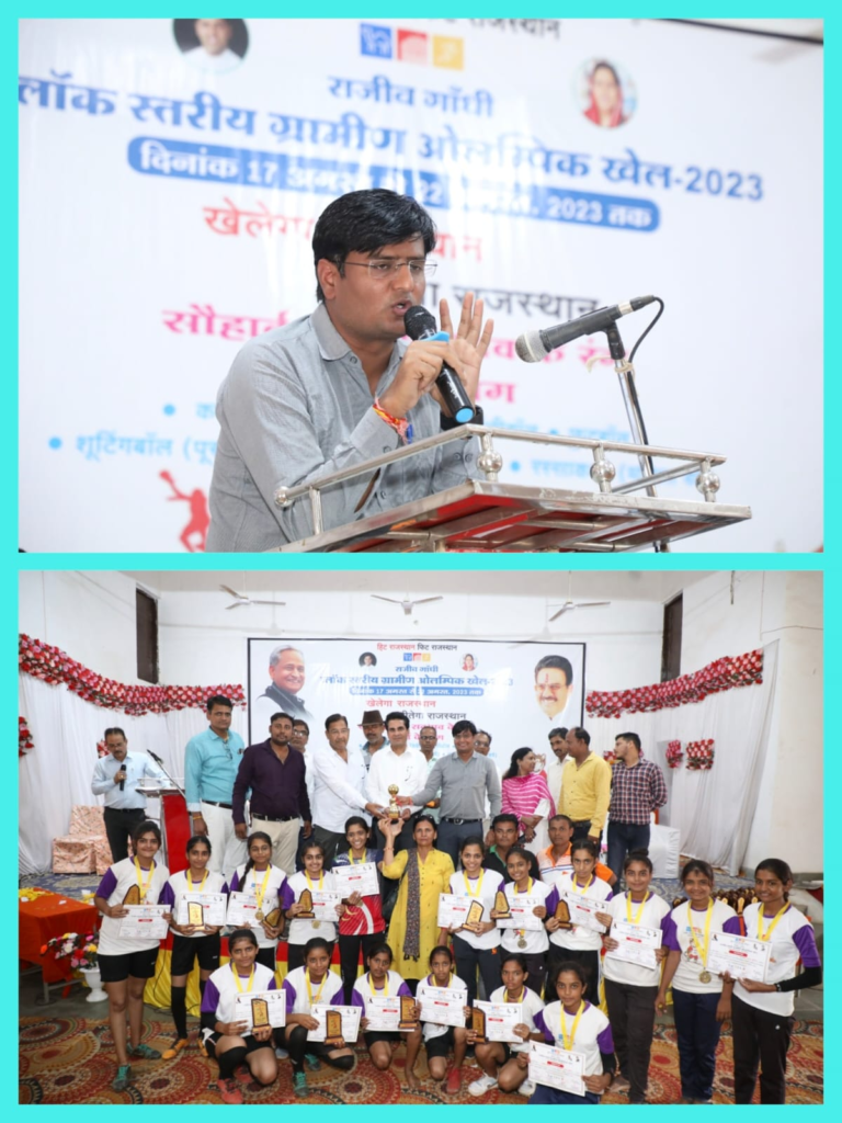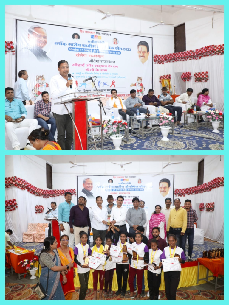 आंजना, शारदा एवं अतिथियों ने विजेता एवं उपविजेता टीमों के खिलाडियों को मेडल व प्रशस्ति पत्र प्रदान कर किया सम्मानित कर उनका उत्साहवर्धन किया। इस अवसर पर बड़ी संख्या में जनप्रतिनिधिगण, अग्रीम संगठनों के पदाधिकारीगण, क्षेत्र के गणमान्यजन, उपखण्ड के प्रशासनिक अधिकारीगण, शिक्षकगण, अभिभावकगण, छात्र छात्राएं उपस्थित थे।